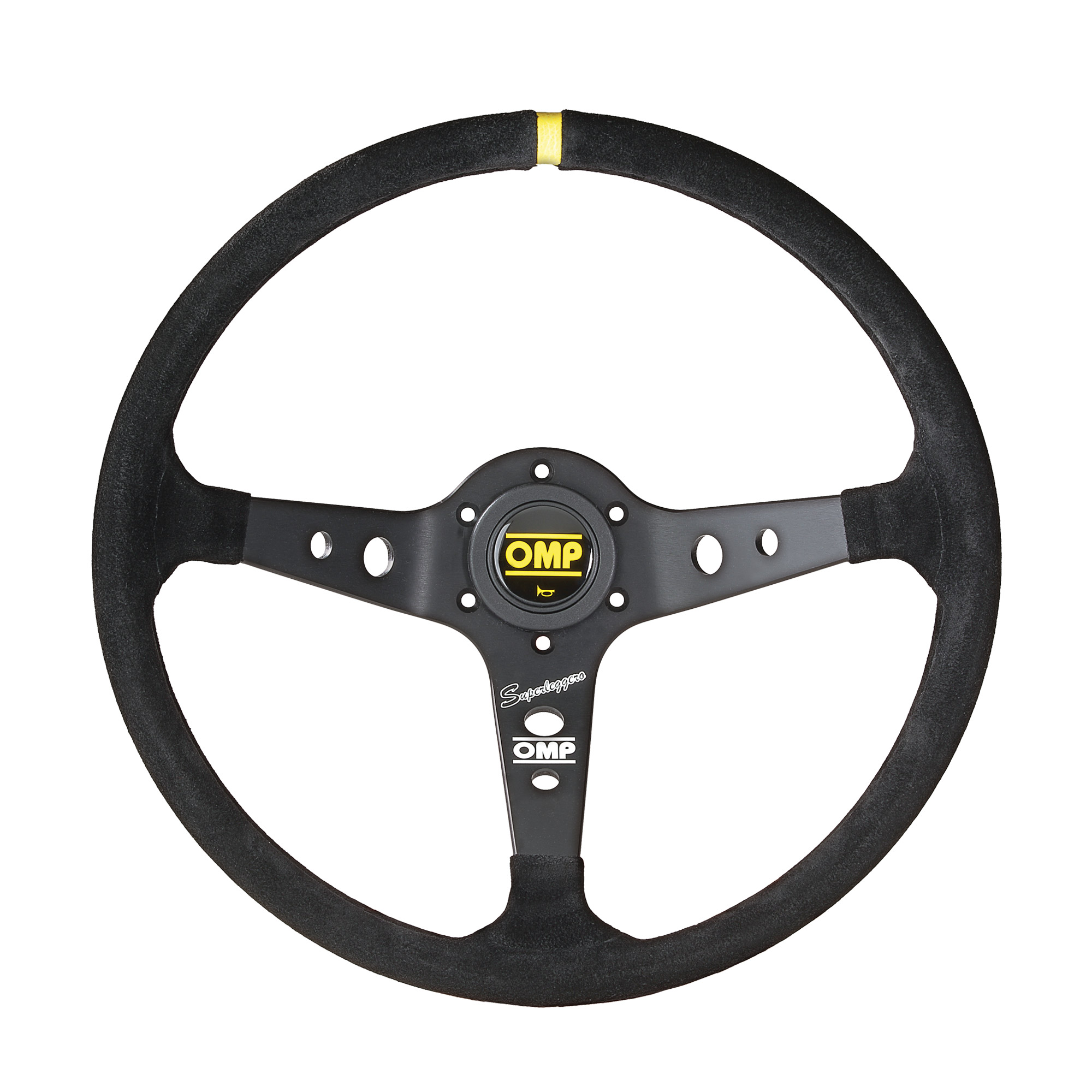Dished steering wheel with 3 black anodized aluminium spokes, in suede leather, black stitching. Supplied with horn button. Depth 95 mm.