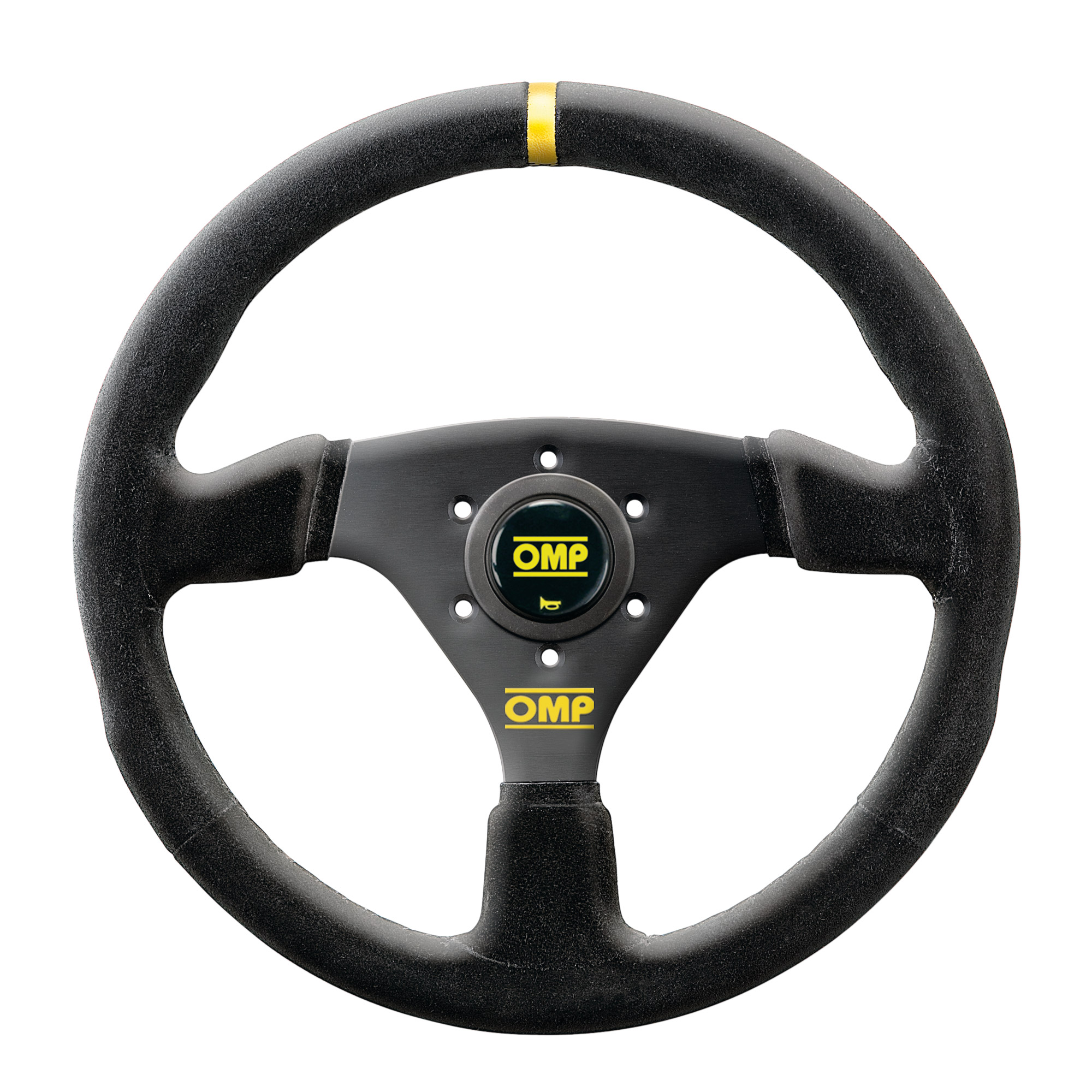 Flat steering wheel, in suede leather, with 3 black anodized spokes. Supplied with horn button. Black stitching.
